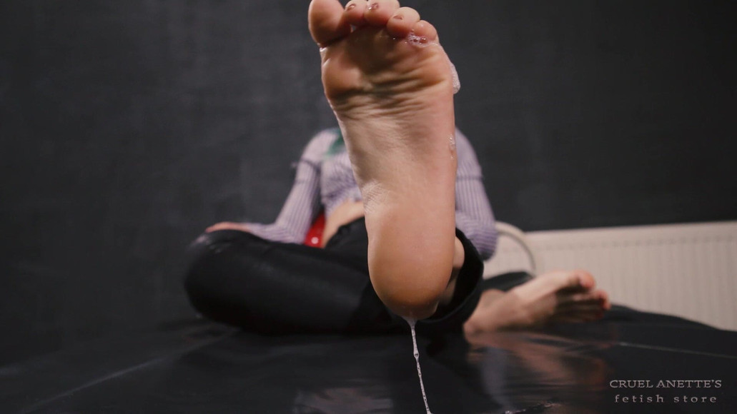 Mistress Anette enjoys her cigarette, but while she smokes, she uses her slave too. As she is sitting on the bed, she makes the slave lick her soles and suck on her toes. Then she knocks the ash from her cigarette onto her feet, spits on them and tells her slave to lick and swallow it all.