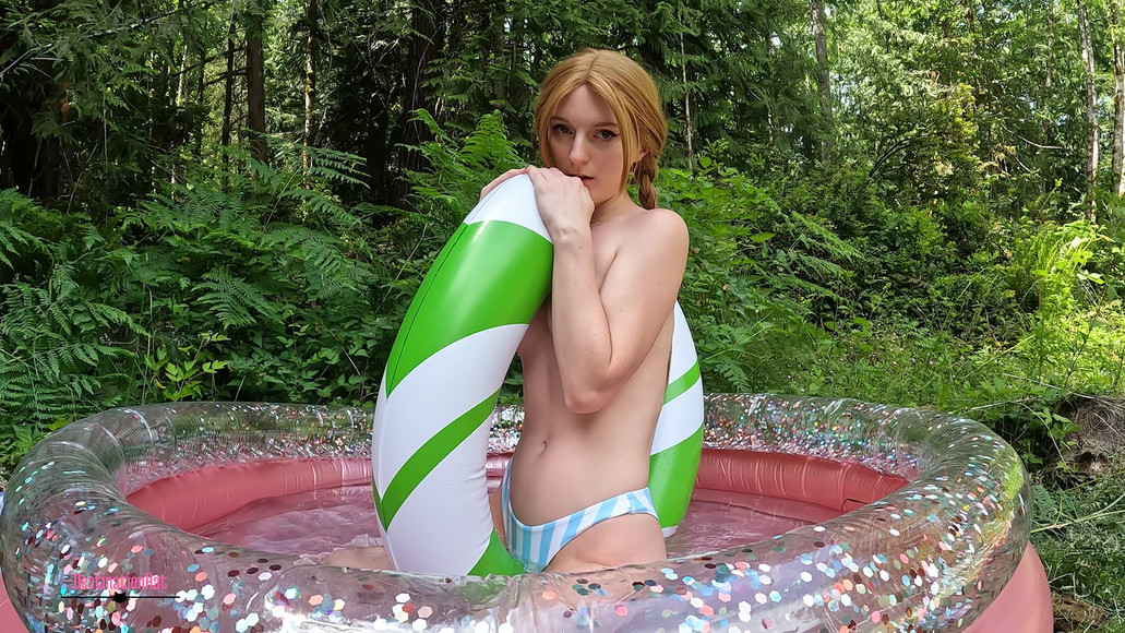 I get on a float and begin humping it. Partway through, I take off my top and keep going to orgasm.