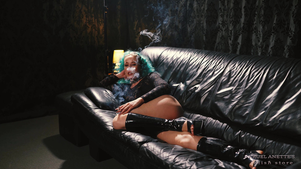 Black lace body with high heel boots, blue hair curled, Mistress Anette is laying on her side on the couch, smoking. After all those hard punishments, she deserves a few lazy minutes.