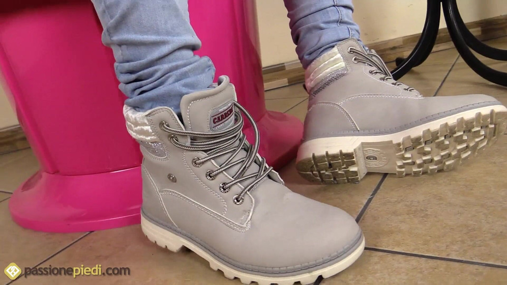 Sharon is a major hottie. In this clip she is wearing a horizontally striped pullover, light blue ripped skinny jeans, ankle-high short nylon socks and a pair of grey lace up ankle boots. Watch Sharon sito on a pink couch, kick off her boots, flaunt her nylon-clad feet and press her toes to the floor. The camera gets so close to Sharon’s feet that you can almost sniff them. Then she finally takes her socks off and places her bare feet on a little table.