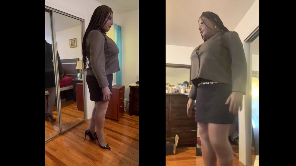 Who is the boss around here? Black babe Danae is wearing a business dress, high heels and pantyhose, ready to go to her office job and showing off her curves. I sit down, cross my legs and briefly rub my breasts and my pussy through my pantyhose and panties.