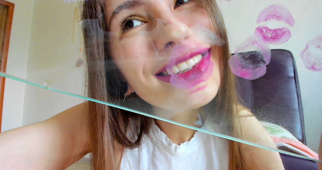 video for lovers of kisses and beautiful lips. In this video, purple lipstick is used. You can see the marks of kissing through the clear glass. these bright lips are so close to you.
