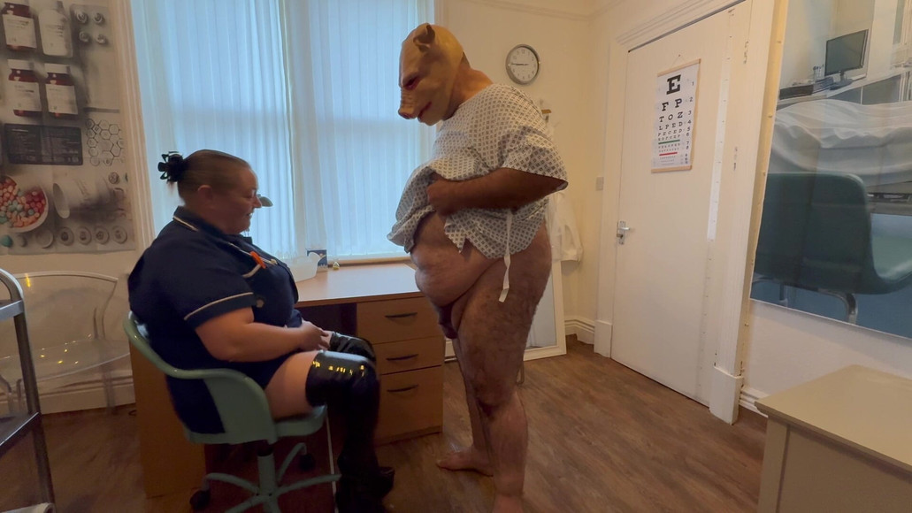 Matron Satana has Satana's Piggy comes to clinic ready for his urine sample gifts and smallow