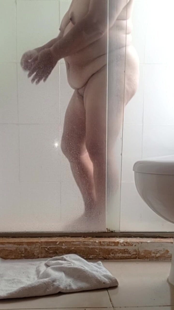 Playing with my stepmother in the shower, she has big, juicy tits and gives me a great blowjob