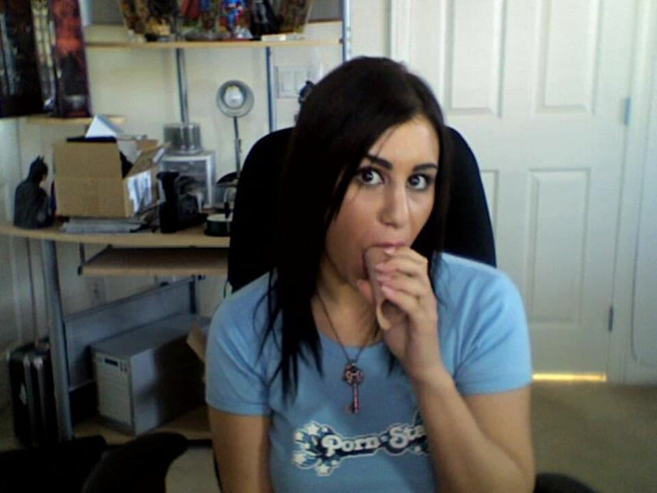 Chesty babe Whitney Stevens takes her top off and sucks on a thick dildo in this video.