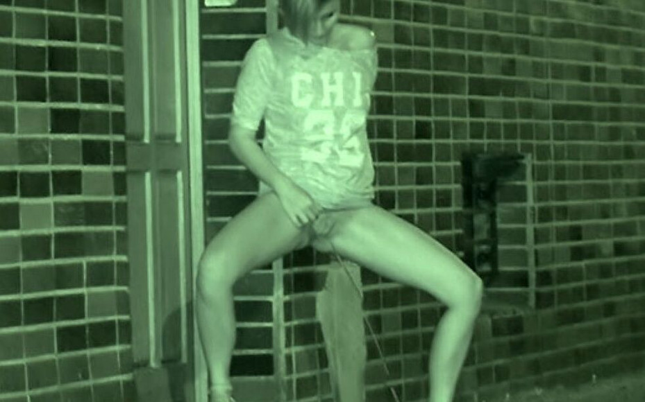 Got2Pee presents "Waterfall" - part of the Puffy Network. A stunning babe is outside at night, trying to get hold of her friend but no one is answering the buzzer. She needs to pee so instead of goes right there and then by standing on the step, and pissing onto the floor below.