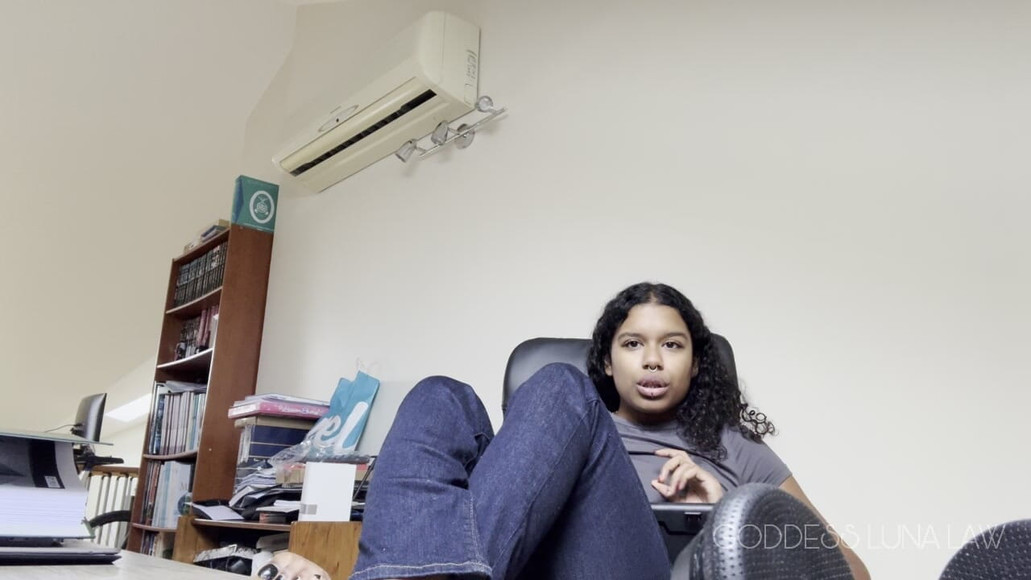 Goddess Luna Law discovers your foot fetish and makes you worship her soft ebony feet at work, Foot fetish POV, Foot Worship POV, Female Domination We are in the middle of a meeting, I'm so tired after walking around in heels over this morning that I rest my bare feet over the desk... which seems like you love to see, seems like you cannot stop staring at my feet... so I ask, ""Are you one of those footboys?"" Your reaction was all I needed. Turns out that's the reason you keep coming to my office! I find it amusing as I tease you about the type of shoes I wear, the nylons on those cold days, and you cannot hide that excitement between your pants.... deep down I always knew, but today I got a full confession! I decide that you are now my work foot bitch, that if you like staring at My feet, i should use you to My enjoyment, make yourself useful... so I make you kiss and worship my wrinkled soles and instruct you on how to suck My toes the way iI like it! From now on