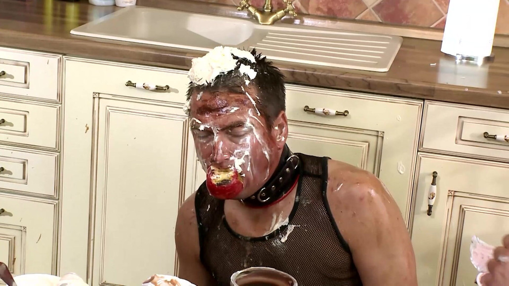 Watch as this submissive slave is dominated and covered in a delicious mess by his mistress. The kitchen becomes a playground of kinky fun and erotic humiliation. 1698