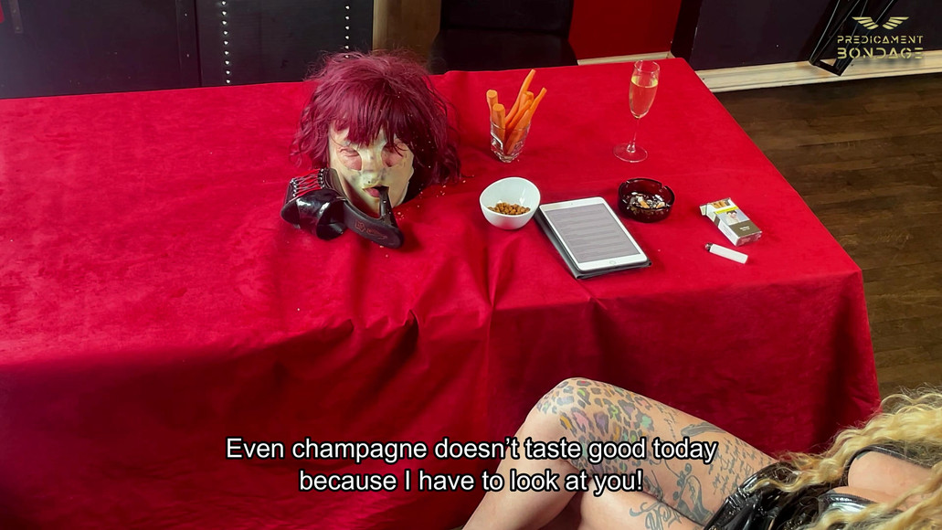 Step into a world of total domination and creative humiliation. The merciless Dominatrix sits at a dining table, her slave’s head locked in the center—exposed, powerless, and humiliated. With razor-sharp words and playful cruelty, she strips away his dignity, reducing him to nothing but an object for her twisted amusement. Her control is absolute. She taunts him, splashes vinegar on his face, smears him with dressing, and decorates him like a grotesque “head on a platter.” Peanuts, vegetables, and her mocking laughter turn the scene into a cruel work of art.