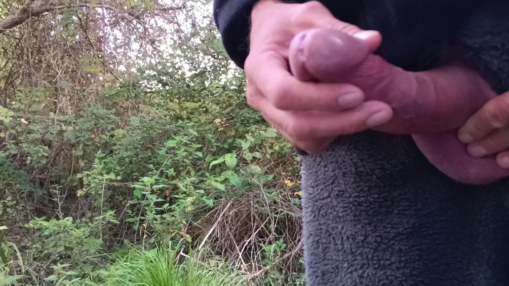 At my favourite woodland cruising spot, getting my cock out and letting it grow. Wanking slowly, rolling the foreskin back and forth, getting more and more excited then squirting a delicious load of cum, slow-mo and close up.