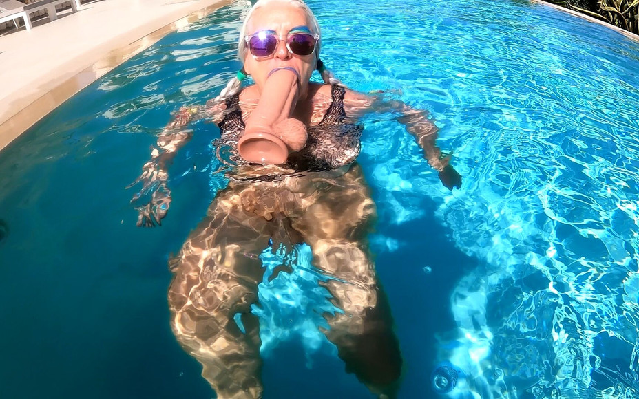 On my day off, I'm enjoying the peace and quiet by the pool. My fetish, as you know, is wearing pantyhose even while sunbathing. I'm also wearing a very short fishnet top. Of course, I love showing off my large, mature pussy lips; they look really great through the nylons. It's pretty hot today—so I'm off to the pool right away. But before I do my laps, I have to quickly pee in the water before I go swimming. Finally, swimming—you can also watch me with the underwater camera and always see my huge, wet pussy. Next time, you'll be there too—deal?