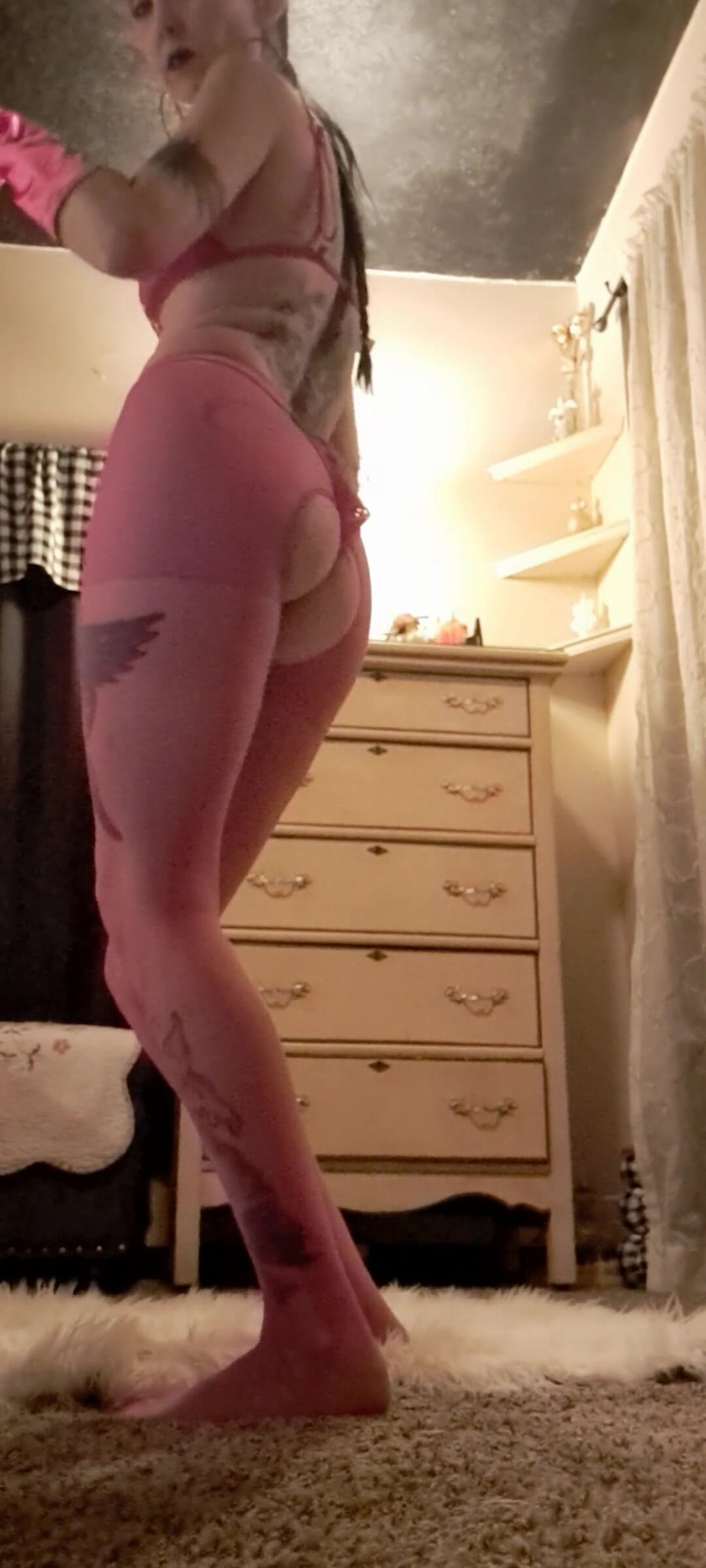 Slow & Sensual Striptease For My Sissy My slave chose pink, so I get all dressed up in sexy, hot pink lingerie and do a slow and sensual striptease for my favorite sissy slave. It's MUCH easier to show than tell.... now my slave will know exactly what I want the next time I tell them to dance for Me. - strappy pink lace, satin gloves and matching sheer crotchless pantyhose