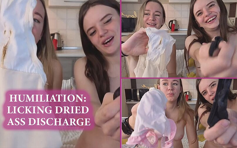 Get ready to be our pathetic little panty slave, you worthless worm. Watch as we dangle our crusty, sweat-soaked panties right in front of your face—the ones we've worn for days, stained with our dried pussy juices and ass sweat just for a loser like you. "Sniff them deep, you disgusting pig," we taunt, shoving the filthy fabric against your nose until you're gagging on the musky stench. Then, "Lick every last flake off, taste our superior scent while we laugh at your desperation." Feel the humiliation as we make you worship our dirty secrets, begging for more degradation