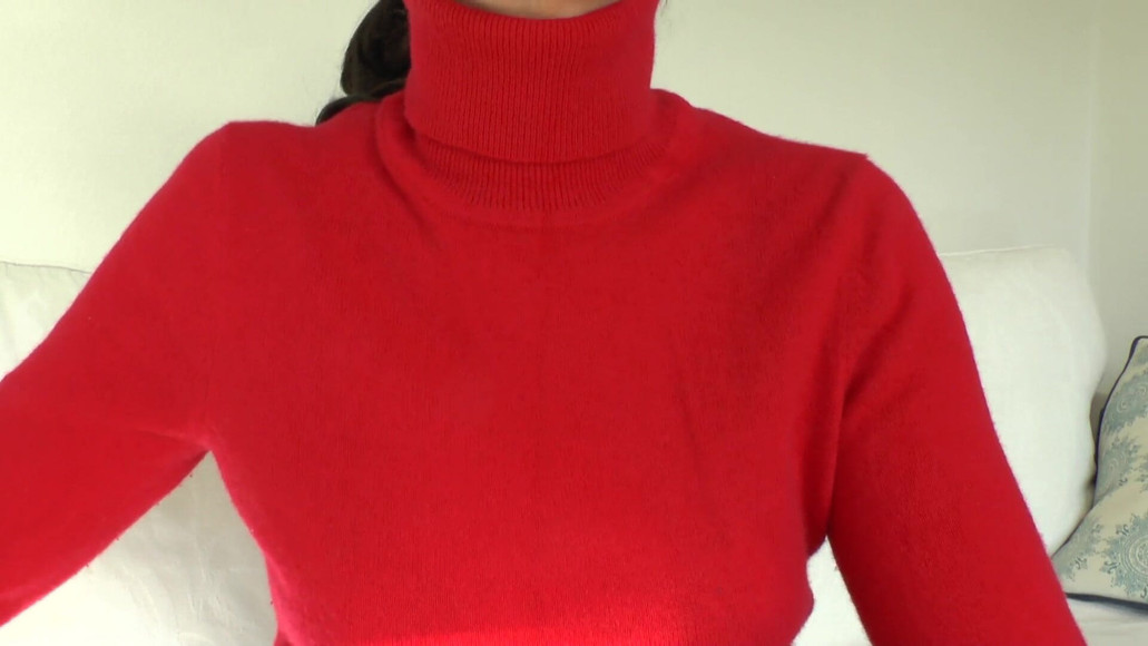 Today I'm wearing a gorgeous, tight red cashmere turtleneck sweater and a tight leather skirt. You can stare at me again. You can sniff my sleeves. I'll rub them on your face. And you can bury your face in the sweater again. Stepmother sweaters are so cozy and soft. You can really let loose and masturbate. And finally, you cum on my sweater!