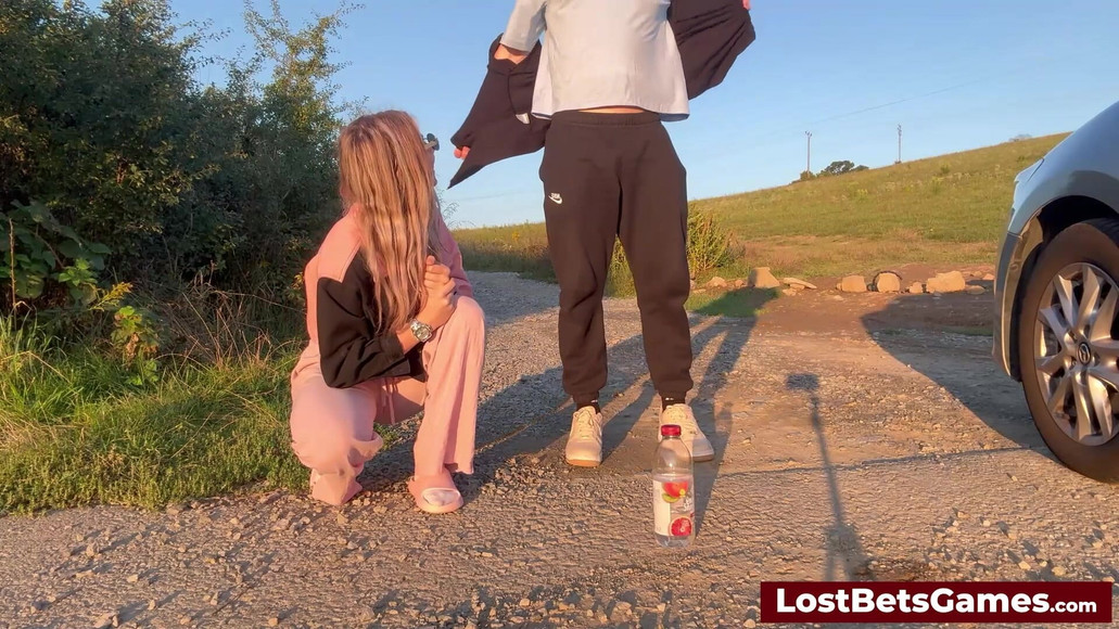 In the heart of nature, Alex and Nicole turn up the heat with a thrilling game of Strip Bottle Flips, where the rules are simple and the stakes. Suddenly, a car appears, catching them in a playful, naked moment.