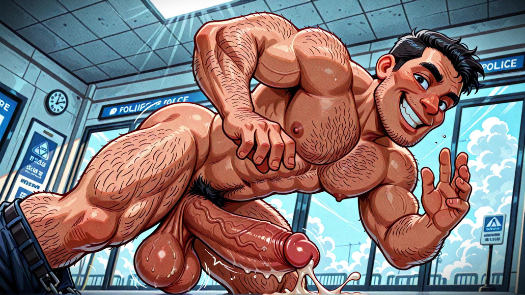 Hot digital art for gay men. Original characters made with AI. Muscular police officers strip down and show their beautiful big penises, fully erect, with cum shooting out, at the police stations.