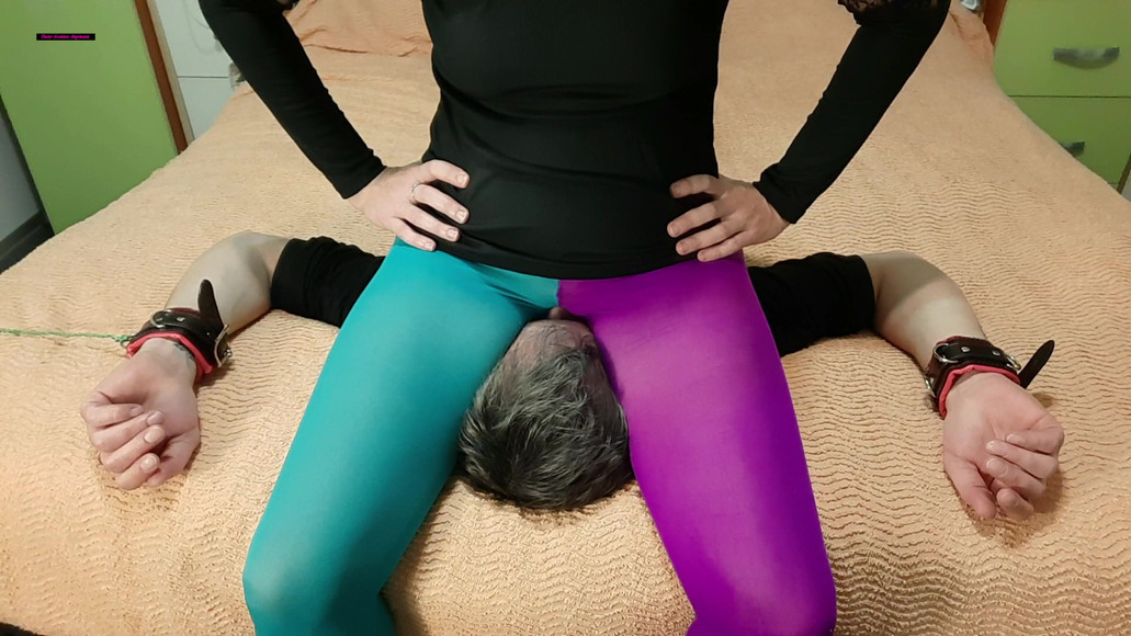 The beautiful and cruel goddess Stephanie is wearing colorful pantyhose. Joe is on the bed with his hands tied. She shakes her ass in his face and then sits on his face. Joe's face is deliciously buried under her delicious pussy lips. Stephanie has no intention of getting up; she wants to stay on his face for as long as possible. Joe fights, wanting to get out and get some air, but the goddess follows his movements and repositions him perfectly under her pussy. The goddess wants to extremely under her pussy. Joe is out of breath and tries everything he can to get air, barely managing to get a small air. Stephanie continues to mercilessly the entire time.