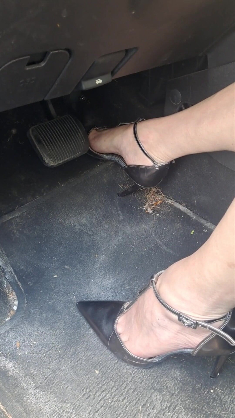 Focus is my feet in heels, bare & in an adorable ballet flat all hitting the gas pedal to rev my car engine. Vroom Vroom