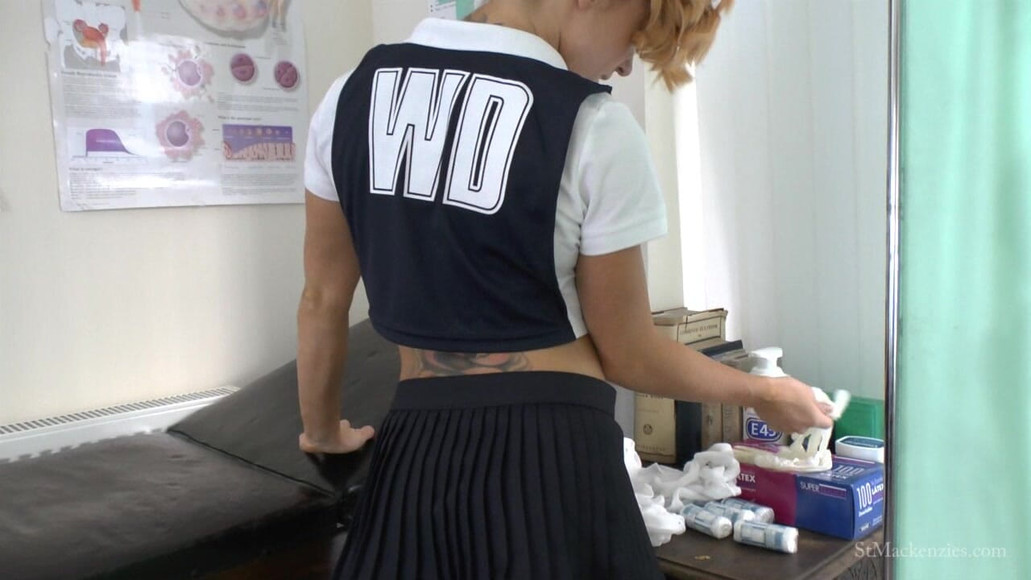 Mercedes is hiding out in Matron’s room so she can skip her netball lesson. As she waits for the lesson to be over she has a look around Matron’s room hoping to find something to pass the time, and he is in luck when she finds Matrons latex gloves! She stretches them across her body, smells them and plays with them. She is clearly enjoying how they feel and she starts to lip off her gym kit, wanting to feel the latex on more of her bare skin. She slips on a pair of the gloves she runs her hands all over her body feeling the latex’s unusual texture. As she plays with them she bites the ends, stretching them off her fingertips. Mercedes clearly loves the latex and soon she is completely naked apart from the gloves and as she grabs a third cannot resist blowing it up and stretching it even more, then letting it go so it pings against her skin.
