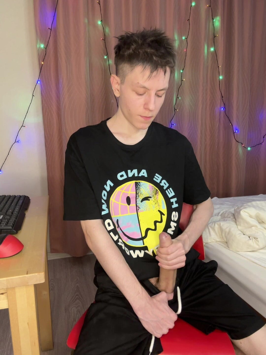 I’m an 18-year-old skinny twink with a massive young cock that barely fits in my hand. Watch this amateur twink strip totally naked. Grab that big cock and start a hot handjob. Slow strokes from the base up to the shiny head. Then faster and faster till the veins bulge and my balls slap against my thigh. My abs flex tight. My back arches. And boom-huge gay cumshot! Thick ropes of cum blast across my chest. Drip down my abs. And I milk out the last drops onto my fingers. Homemade solo from a cute gay boy who knows how to edge himself to explosion.