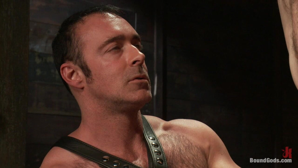 In order to welcome new Dom Brad Kalvo, house slave Cody Allen is sent to greet him. Brad is skeptical of the boy’s worth but indulges him by going to the bondage wall and choosing the day’s implements. Back in the dungeon Cody shows Brad why they call it the cocksucking chair and Brad helps himself to the 19 year-old’s ass. Suspended on the wooden wedge Cody is strained by the pressure on his taint. Brad takes the taser to Cody as he holds the bowling ball tied to his own zipper. With each zap his grip loosens. Back in the cocksucking chair Cody rides the master’s dick. Brad then turns him around, fucks his ass, and blows his load all over the boy’s face.