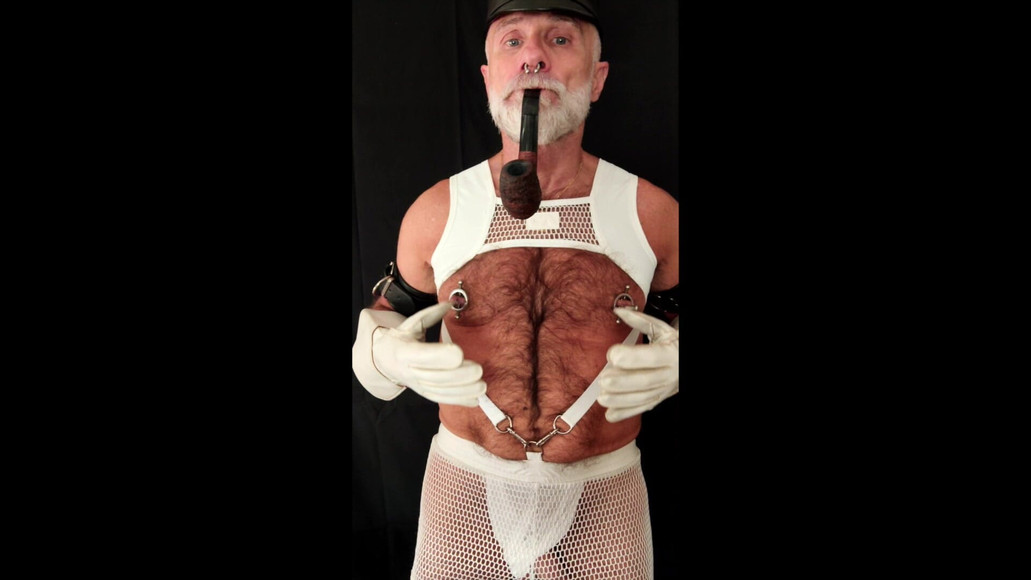 Stepdad smoking his pipe and playing with nips in white sexy gear